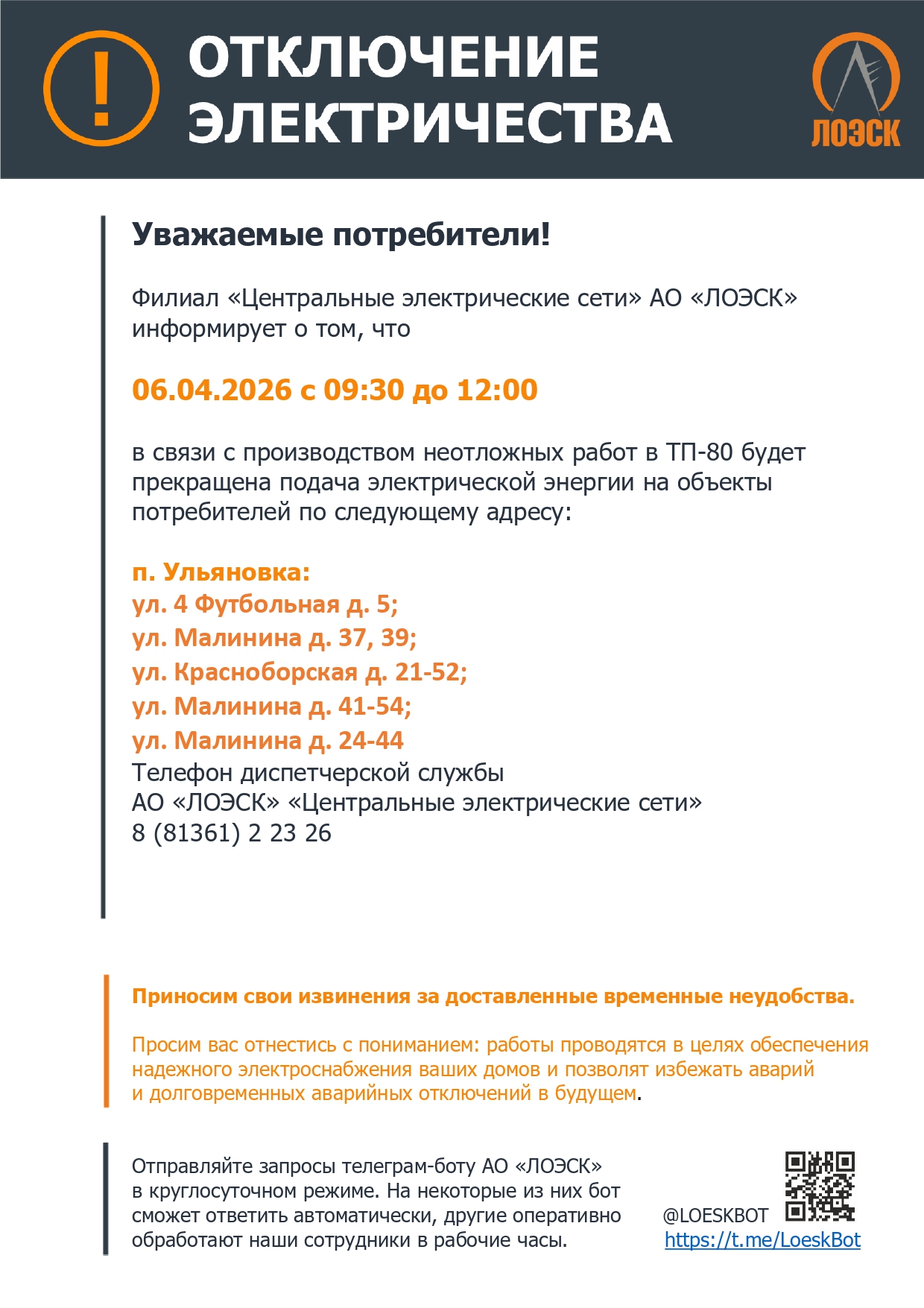 06.04.2026 с 09.30 до 12.00 будет прекращена подача электроэнергии